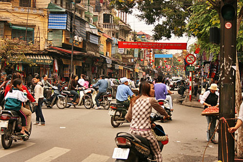 There's no doubt visitors to Hanoi - especially the food-centric ones - notice the constant presence of edible stuff on their strolls around the Old Quarter and further afield. Street-side meat, bicycles laden with fruit and vegetables, simmering pots of stock on doorsteps, boiling kettles, tipping teapots, sacks overflowing with rice - the streets are where the food action is at, not hidden indoors in gigantic supermarket halls nor protected behind glass windows or cabinetry. One can reach out and touch food up and down the length of any Hanoi street. But where there is food there are people. Hanoi is definitely not a western supermarket aisle, where even shouting blue murder is unlikely to bring customer service assistance.